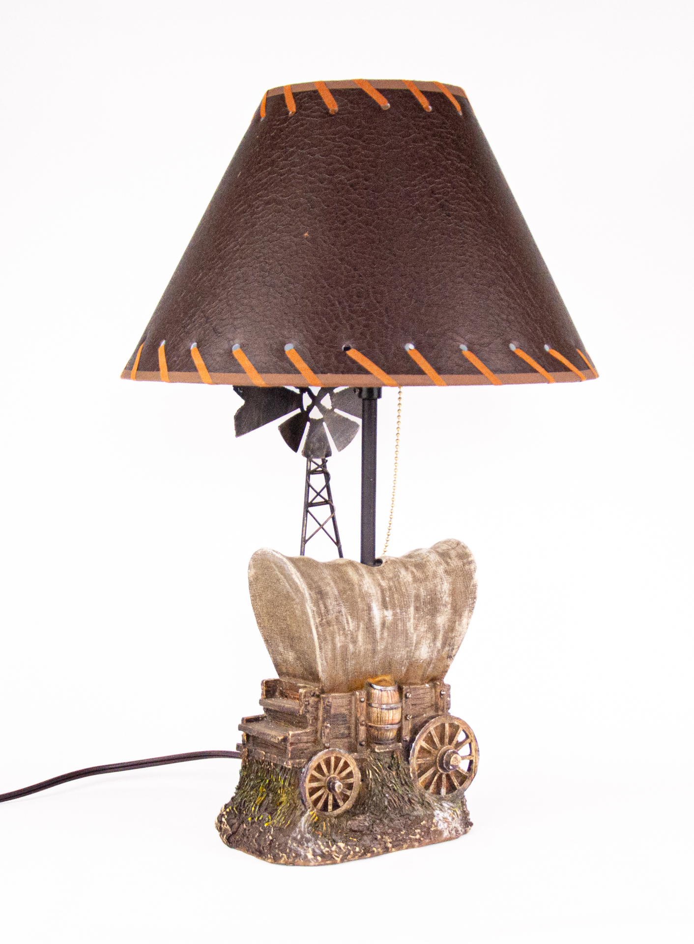 Leve charme e personalidade para a sua decoração com este abajur decorativo de estilo rústico, inspirado no clima do velho oeste. A base em formato de carruagem com barril e moinho traz um visual artesanal e cheio de detalhes, ideal para compor ambientes aconchegantes e temáticos.