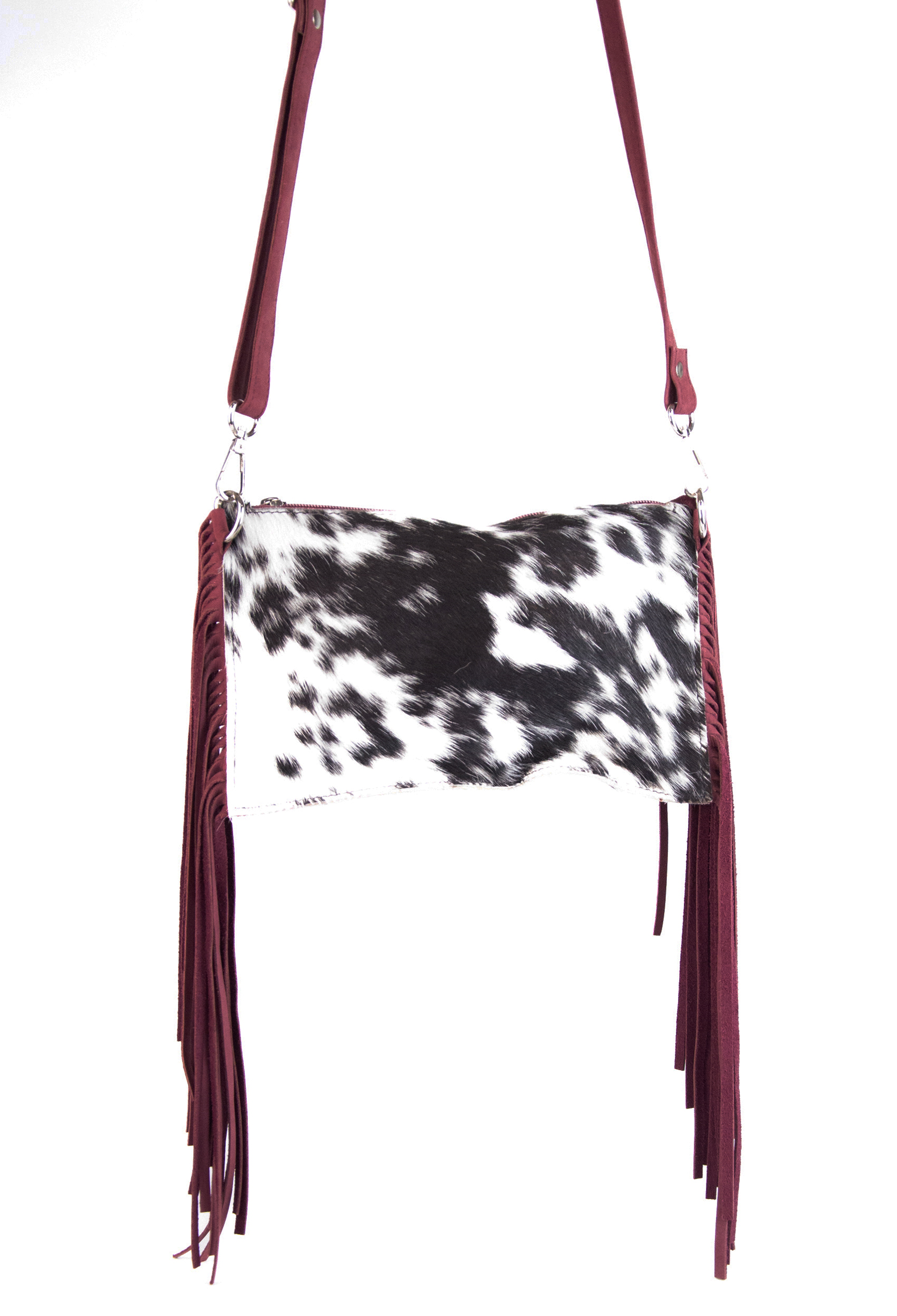 Bolsa importada Western Linens, com estampa estilo cowhide (pelo) e detalhes em franjas que trazem um visual autêntico e marcante. Possui alça transversal e acabamento premium, perfeita para compor looks country e western com personalidade e praticidade.