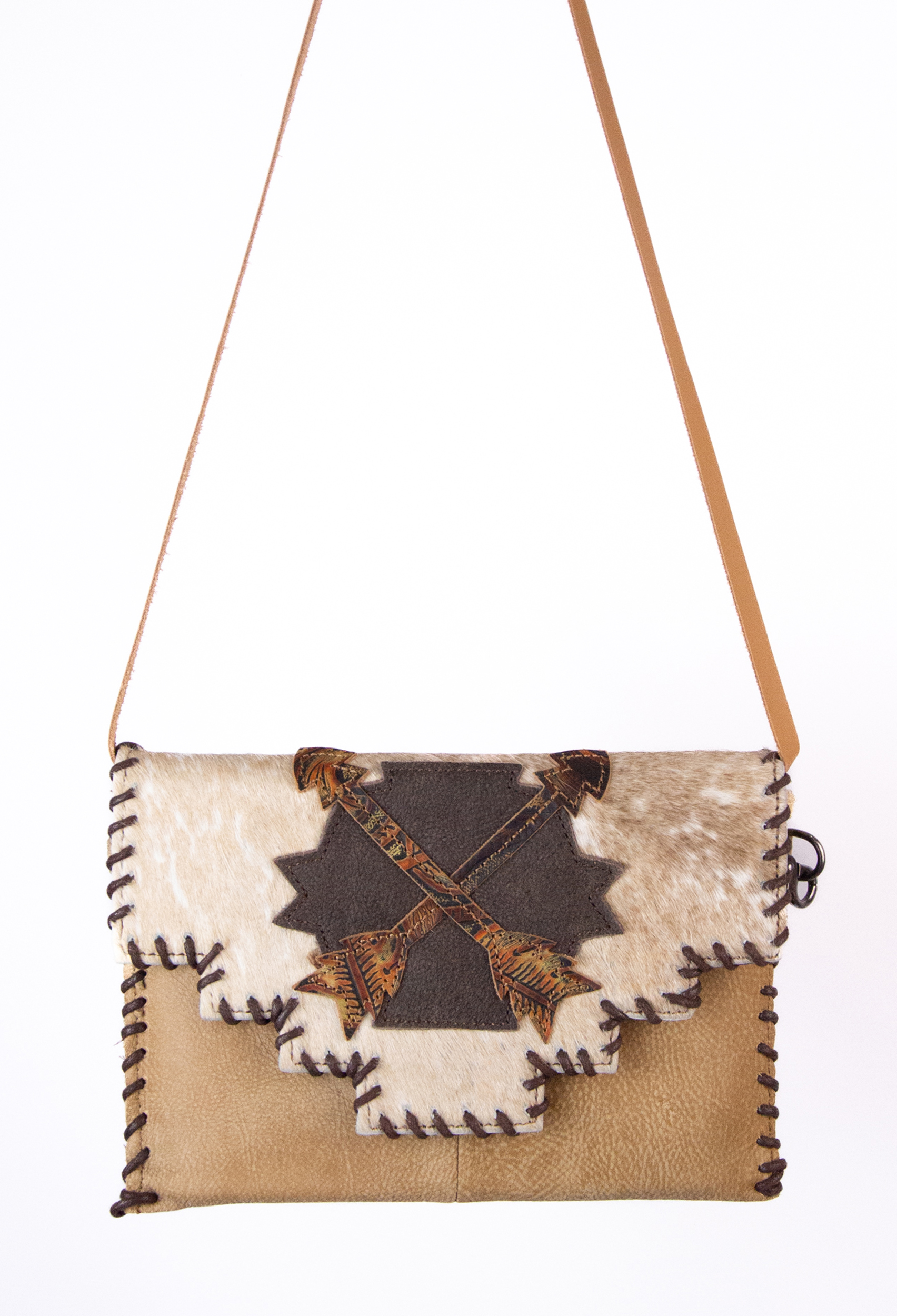 Bolsa estilo western confeccionada em couro legítimo com pelo natural, trazendo um visual exclusivo e sofisticado. O grande destaque fica por conta da aplicação frontal com duas flechas cruzadas, em relevo e acabamento artesanal, que entrega personalidade e autenticidade ao look.
