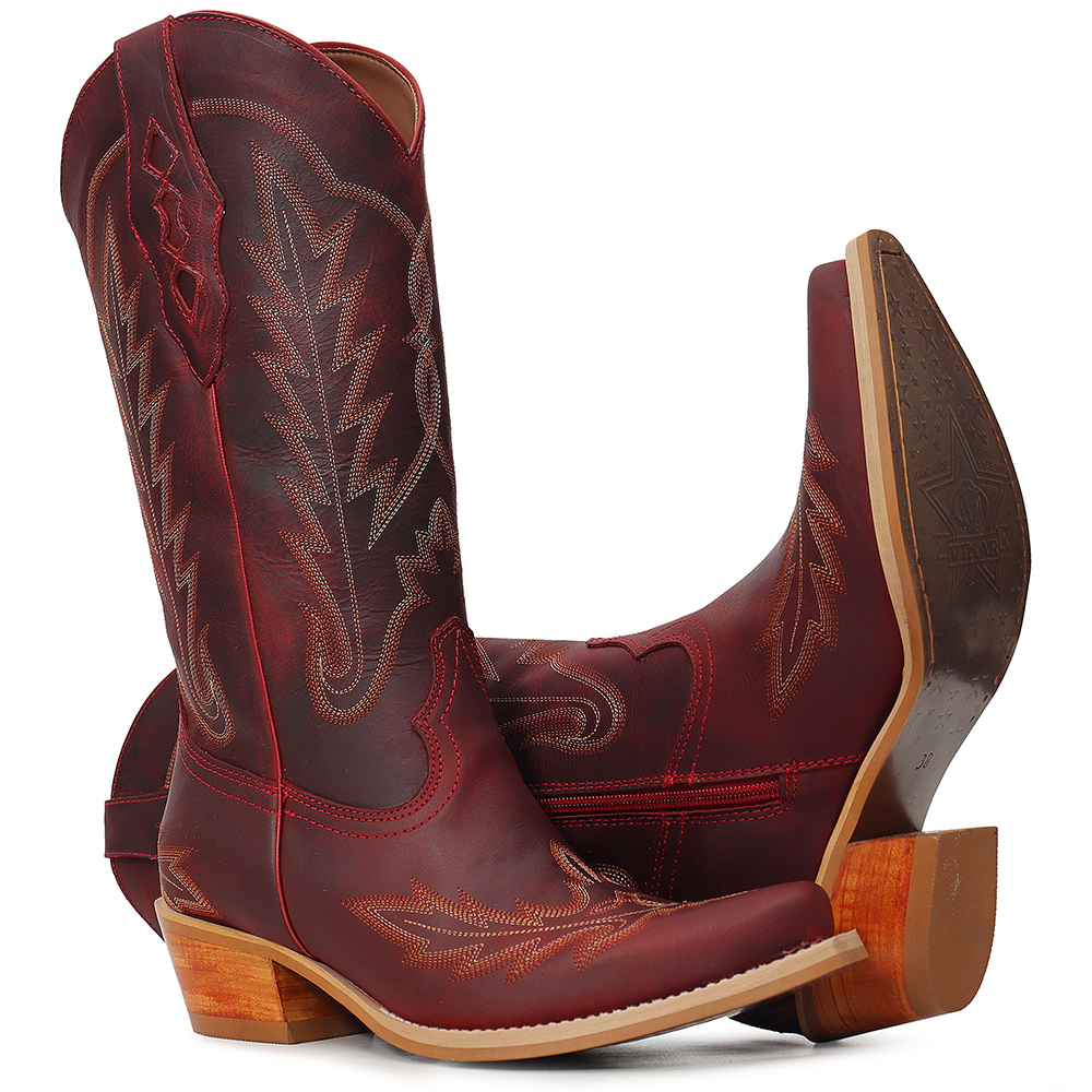 Bota western em couro Legítimo vinho, com bordados clássicos que carregam a força do Velho Oeste.