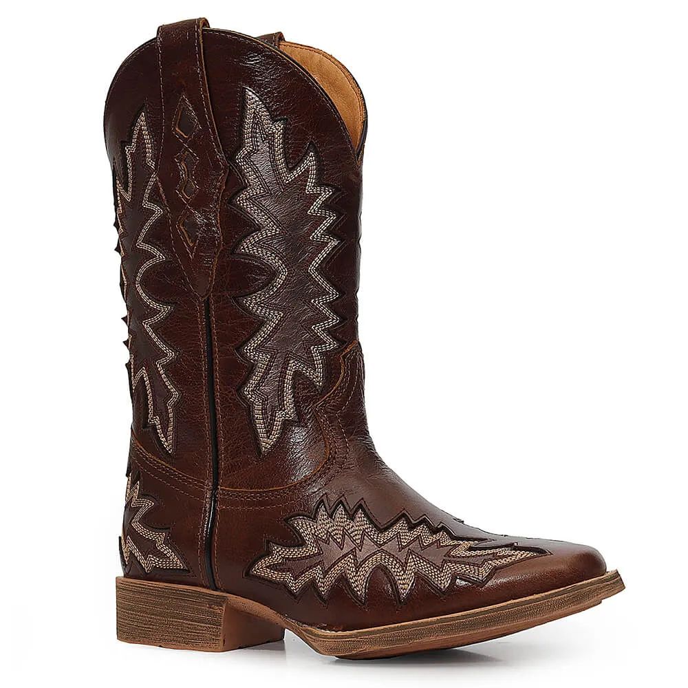 Bota western confeccionada em couro legítimo, com bordados artesanais em tons de marrom e bege que valorizam o design clássico do estilo country. Possui bico quadrado tradicional, cano médio com puxadores laterais para facilitar o calce e solado resistente, ideal para o dia a dia ou ocasiões especiais.