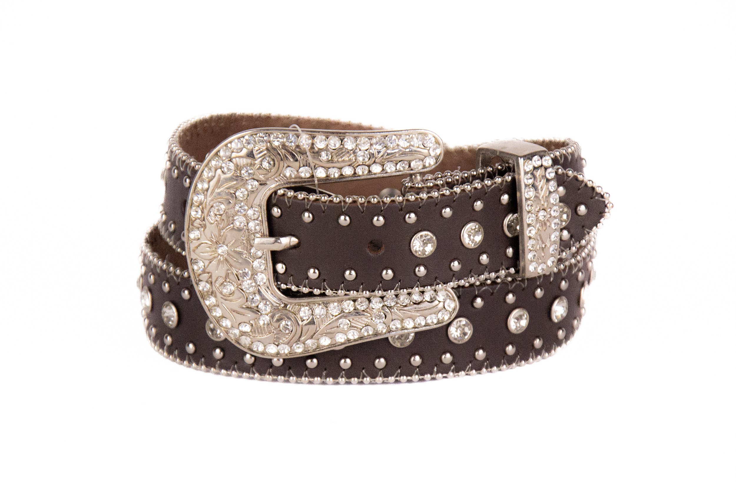 Cinto infantil fabricado em couro legítimo na cor marrom café com apliques de strass e rebites de metal na cor prata, toda sua lateral costurada com corrente de bolinhas em metal