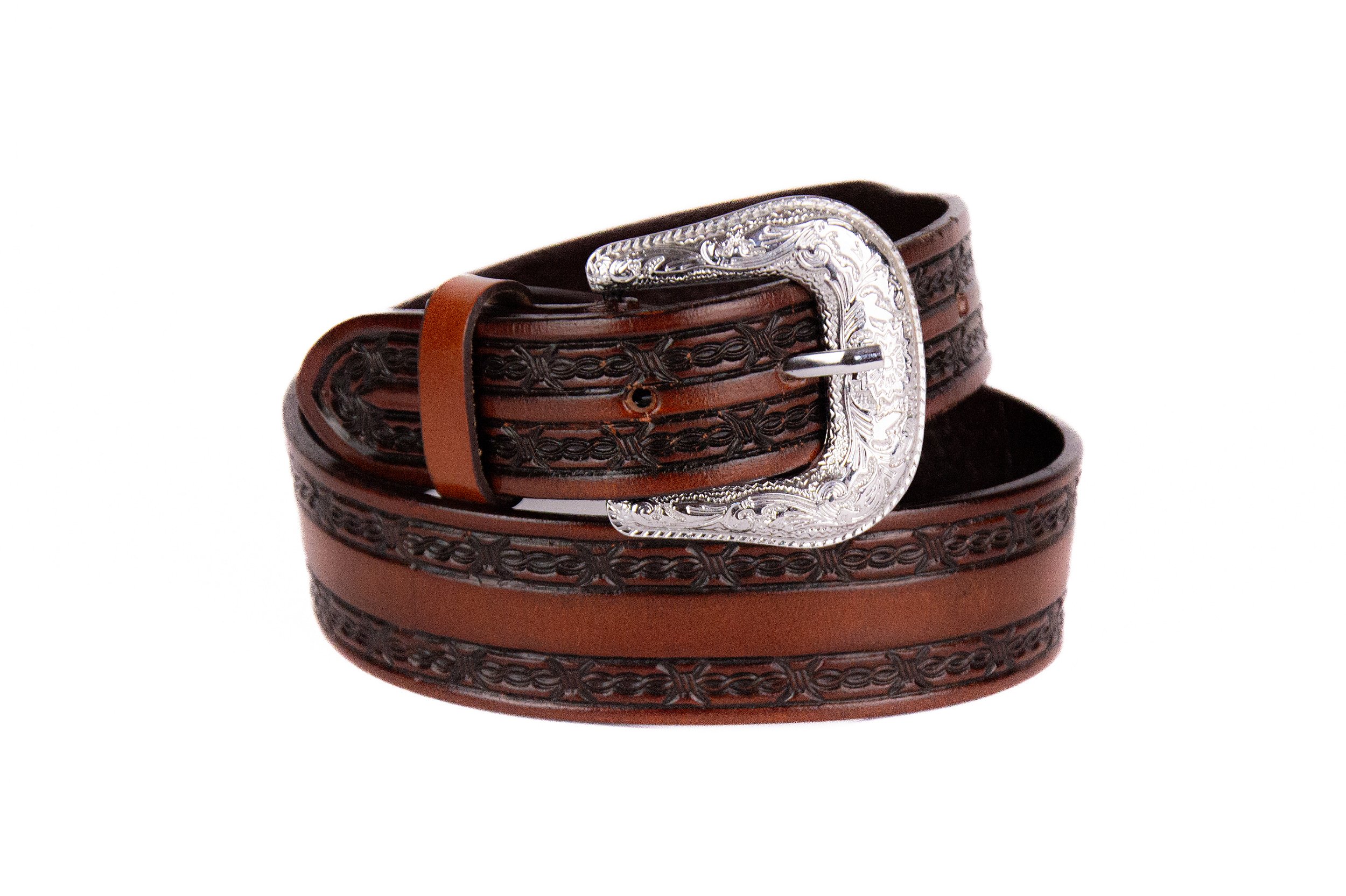 As bordas são trabalhadas no couro com desenhos em forma de arame farpado na cor marrom.