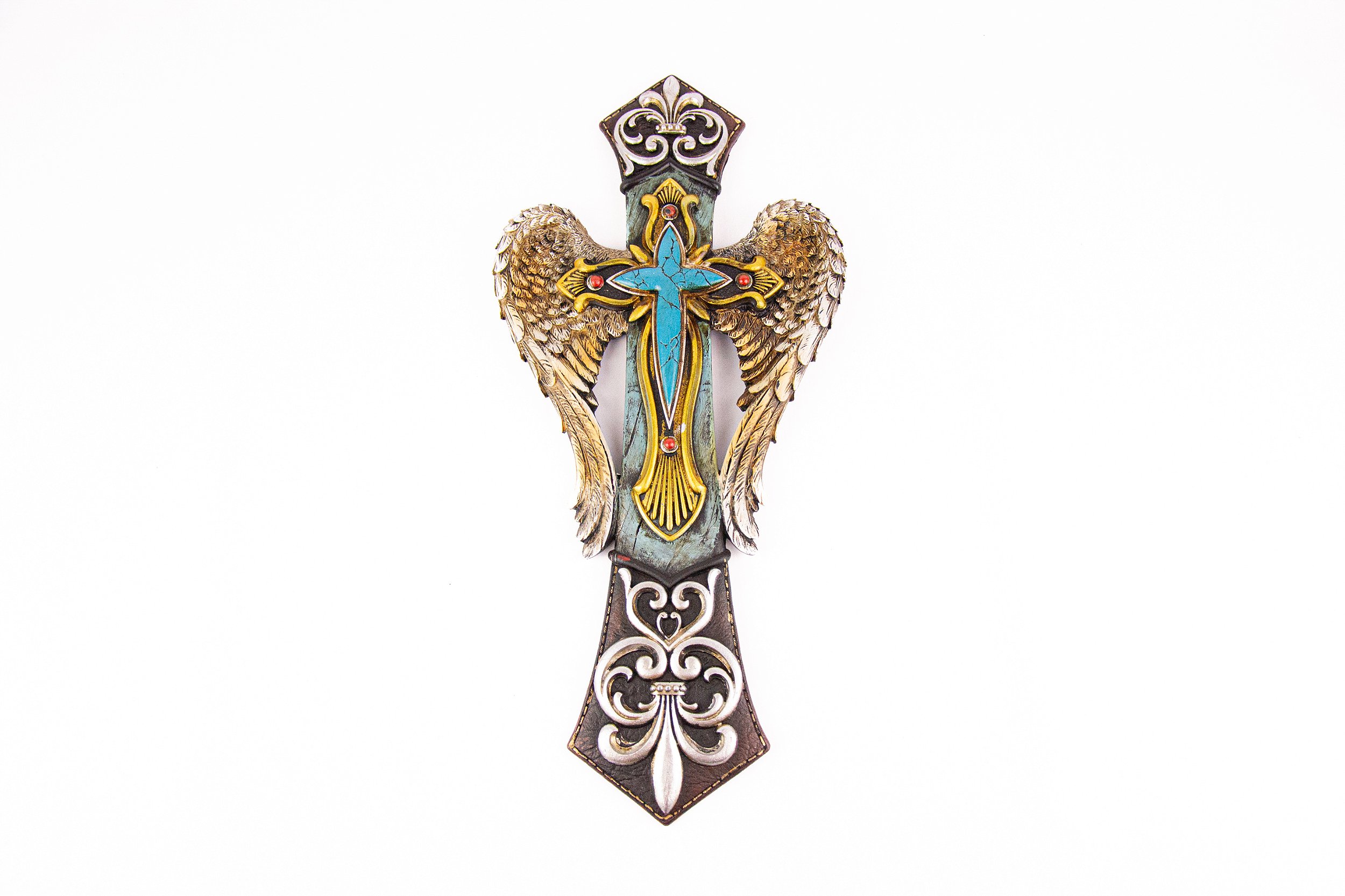Cruz decorativa de parede com design exclusivo e inspiração country western. Produzida em resina , apresenta uma asa dourada .