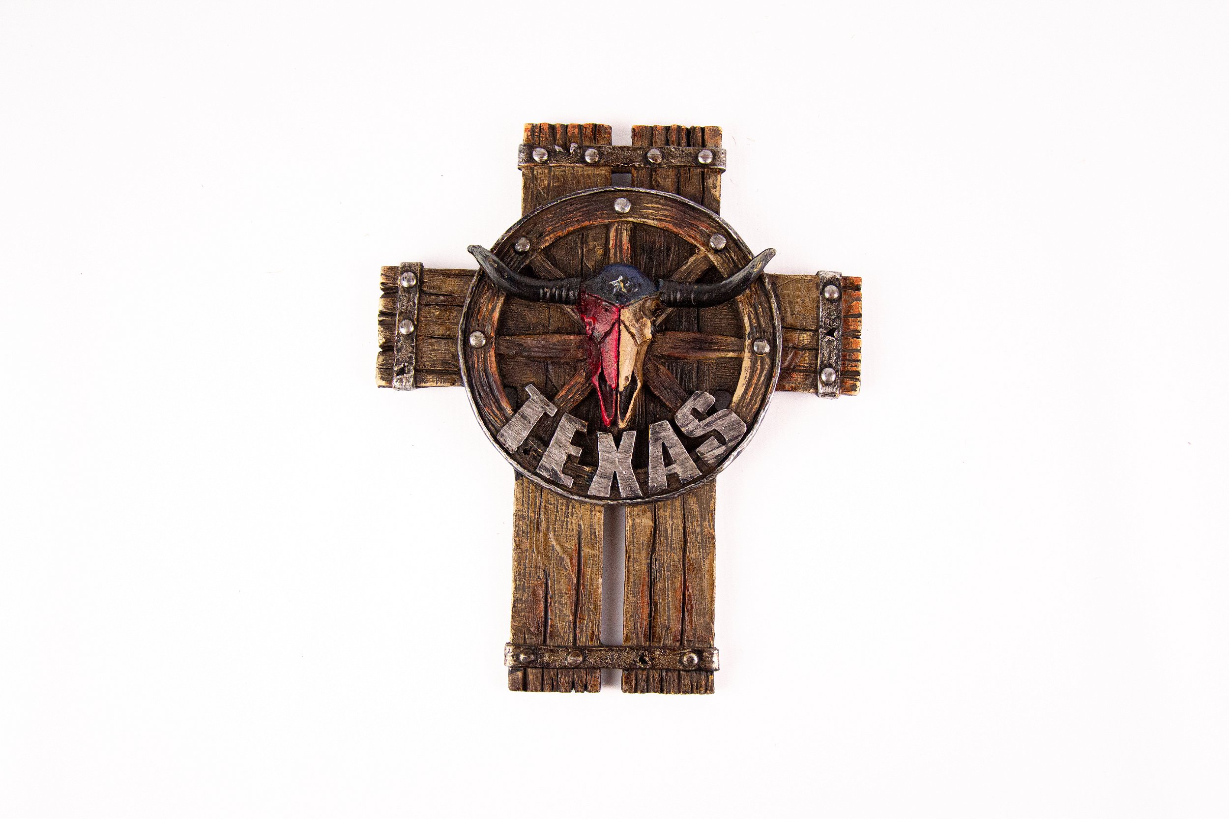 Peça decorativa em formato de cruz, confeccionada em resina de alta qualidade com acabamento que imita madeira envelhecida. Possui aplique central com Cabeça de boi , circundado por aro decorativo e detalhe em relevo com a palavra “Texas”, reforçando o estilo country.