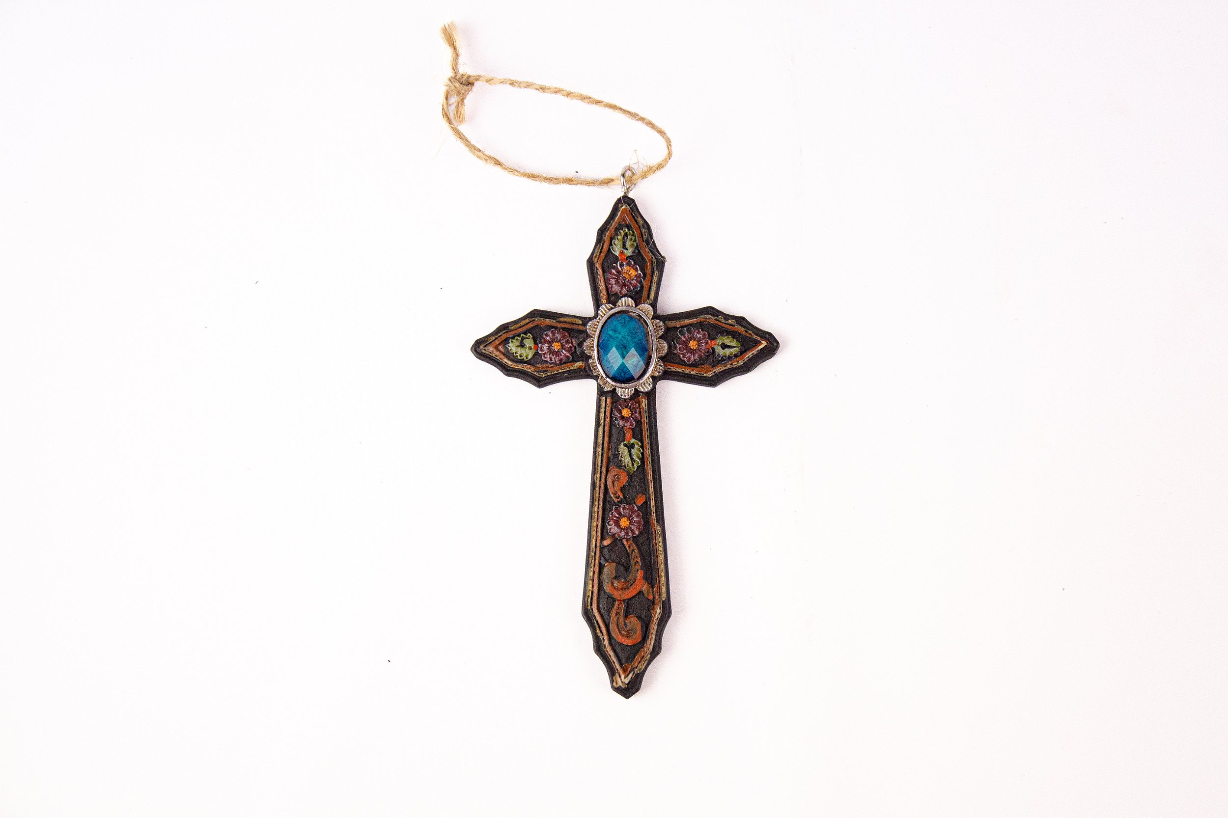 Cruz decorativa para retrovisor com acabamento artesanal e forte inspiração Western. A peça apresenta detalhes florais em relevo, arabescos trabalhados e aplicação central em tom turquesa, trazendo elegância, fé e simbolismo de proteção. Seu visual rústico sofisticado valoriza carros, caminhonetes e também pode ser usada como item decorativo em ambientes country.