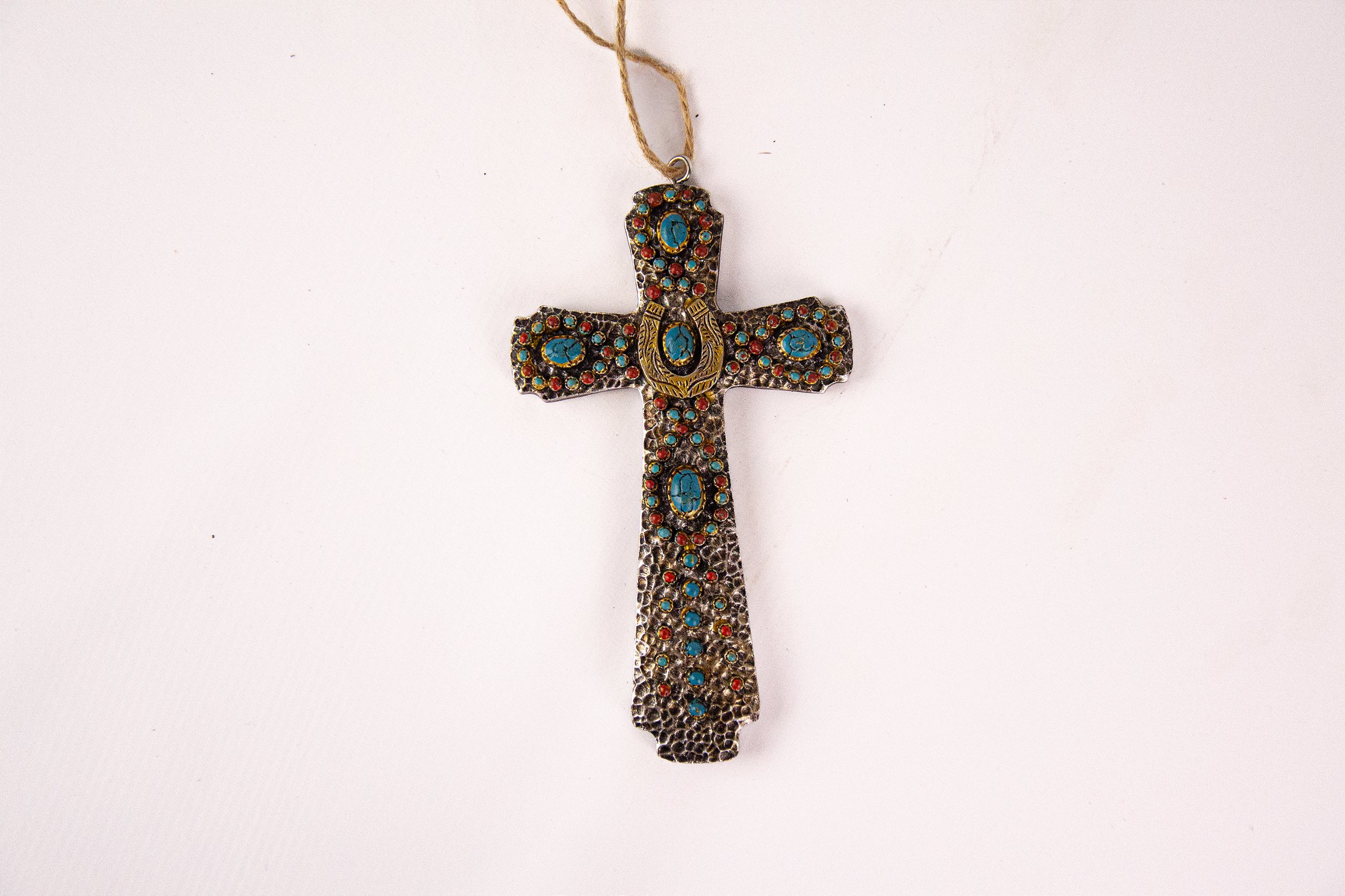 Cruz decorativa para retrovisor com acabamento trabalhado e estética Western sofisticada. A peça apresenta base com textura rústica, aplicações em tons turquesa e detalhes em relevo que valorizam o design artesanal. O destaque fica para o elemento central dourado, que adiciona elegância e simboliza proteção e fé. Ideal para retrovisores de carros, caminhonetes ou como item decorativo em ambientes country e Western.
