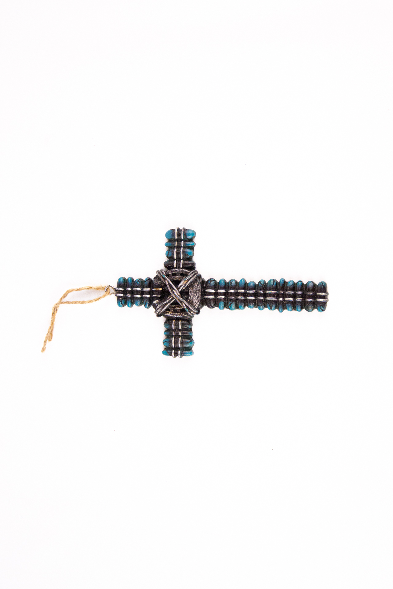 Cruz decorativa para retrovisor com forte inspiração Western e Navajo. A peça possui acabamento em alto-relevo, detalhes em tom turquesa envelhecido e aplicação central com efeito rústico, trazendo personalidade e simbologia de proteção. Seu design marcante combina tradição, fé e estilo country, sendo ideal para retrovisores de carros, caminhonetes ou também como item decorativo em ambientes com estética Western.