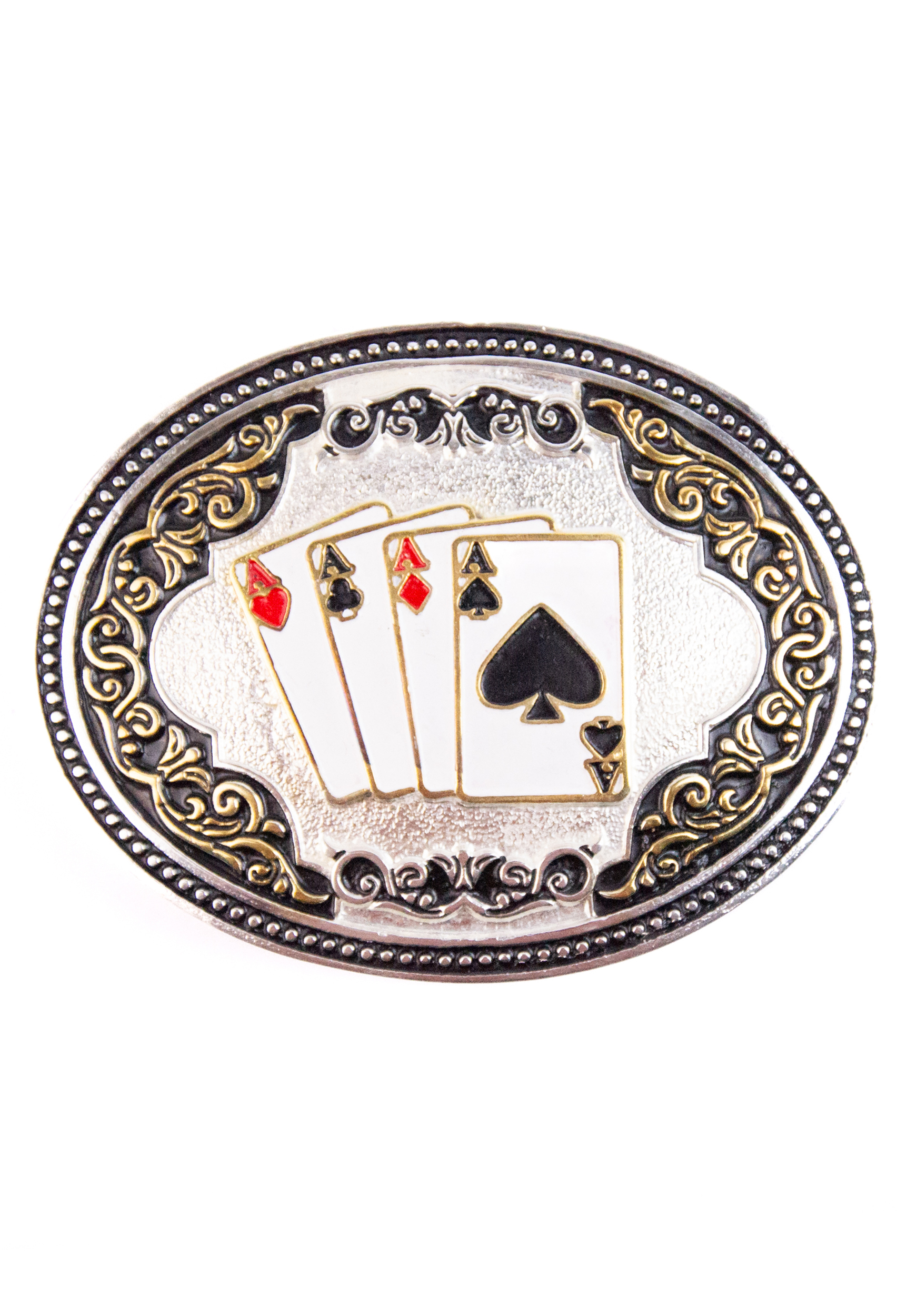 Fivela country com design inspirado em cartas de baralho, trazendo quatro ases em destaque. Possui detalhes trabalhados e acabamento em prata envelhecida, perfeita para quem gosta do estilo western com personalidade.
