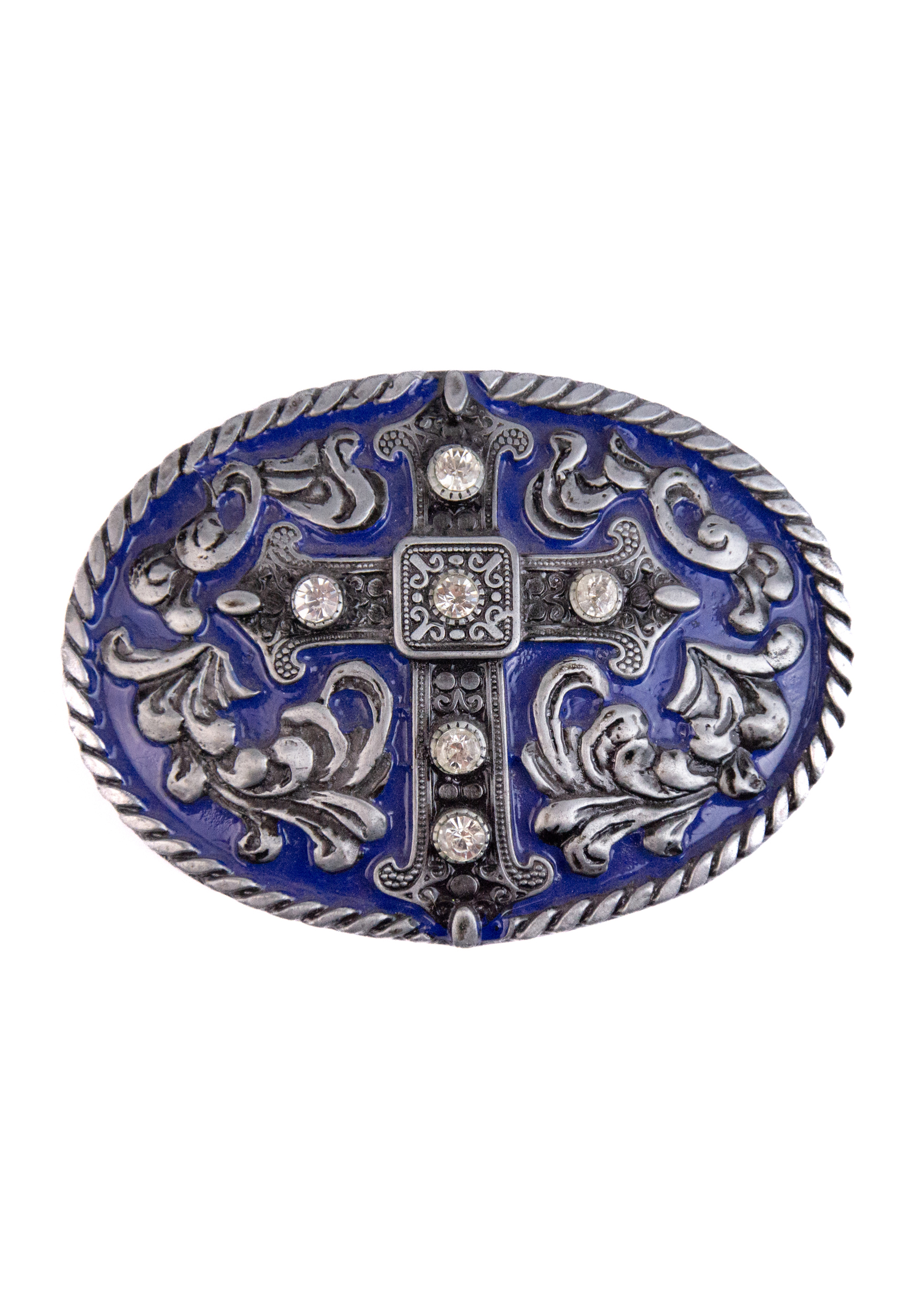 Fivela country com cruz central em alto relevo e aplicação de strass que destacam o brilho da peça. O fundo azul royal e os detalhes trabalhados em prata trazem elegância e um toque marcante ao estilo western.