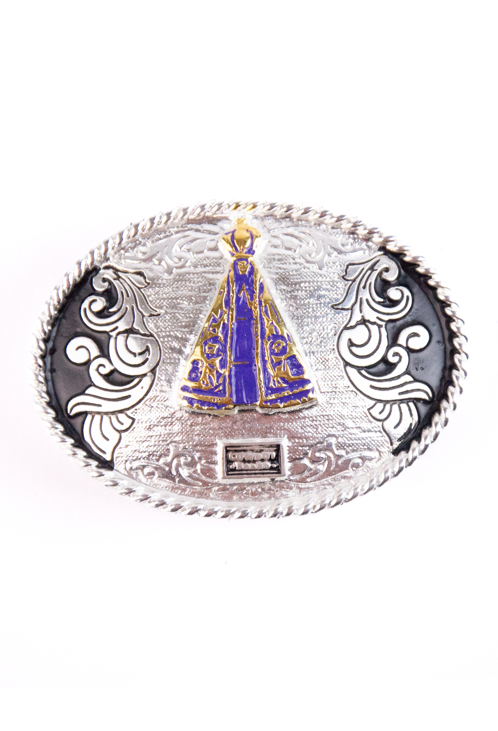 Fivela infantil delicada com Nossa Senhora Aparecida em destaque, com detalhes em lilás e dourado sobre base prateada. Uma peça que une fé, estilo country e charme para os pequenos.