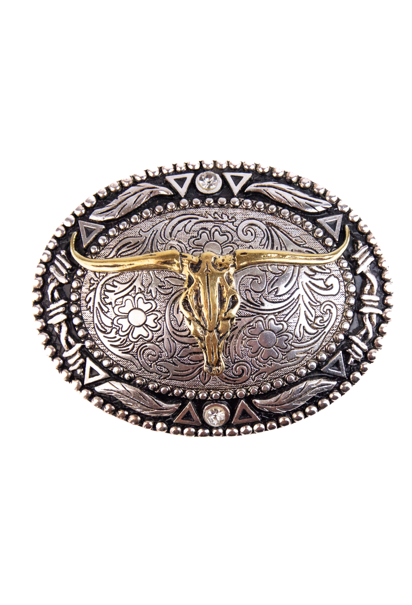 Fivela country com design trabalhado em alto relevo e destaque para caveira de boi (longhorn) em dourado. Possui gravações ornamentais e pedras decorativas que trazem um visual marcante e autêntico ao estilo western.