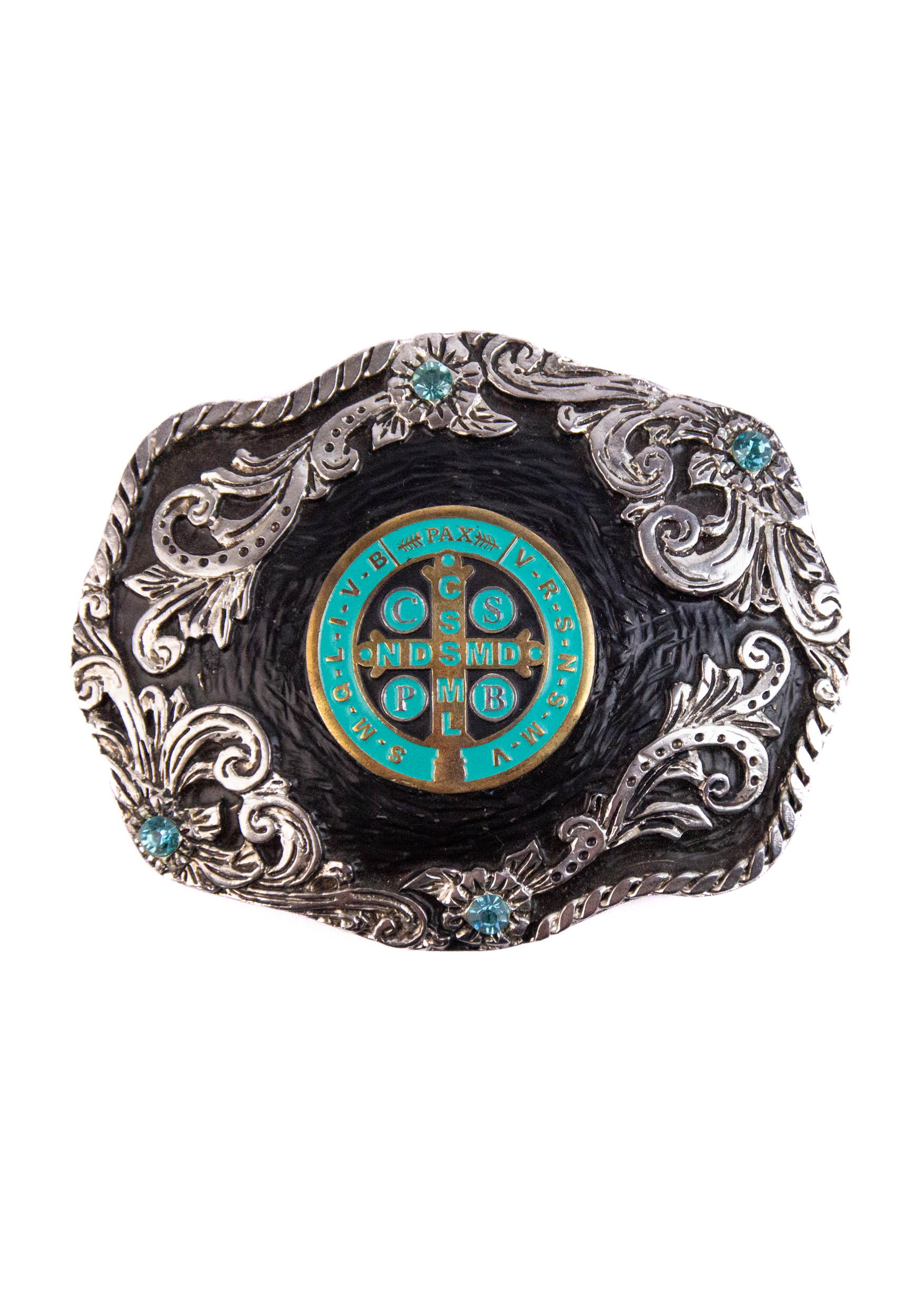 Fivela country com design trabalhado em relevo e detalhes em pedras turquesa. O destaque fica para o medalhão central inspirado na cruz de São Bento, trazendo estilo marcante e cheio de personalidade para o visual western.