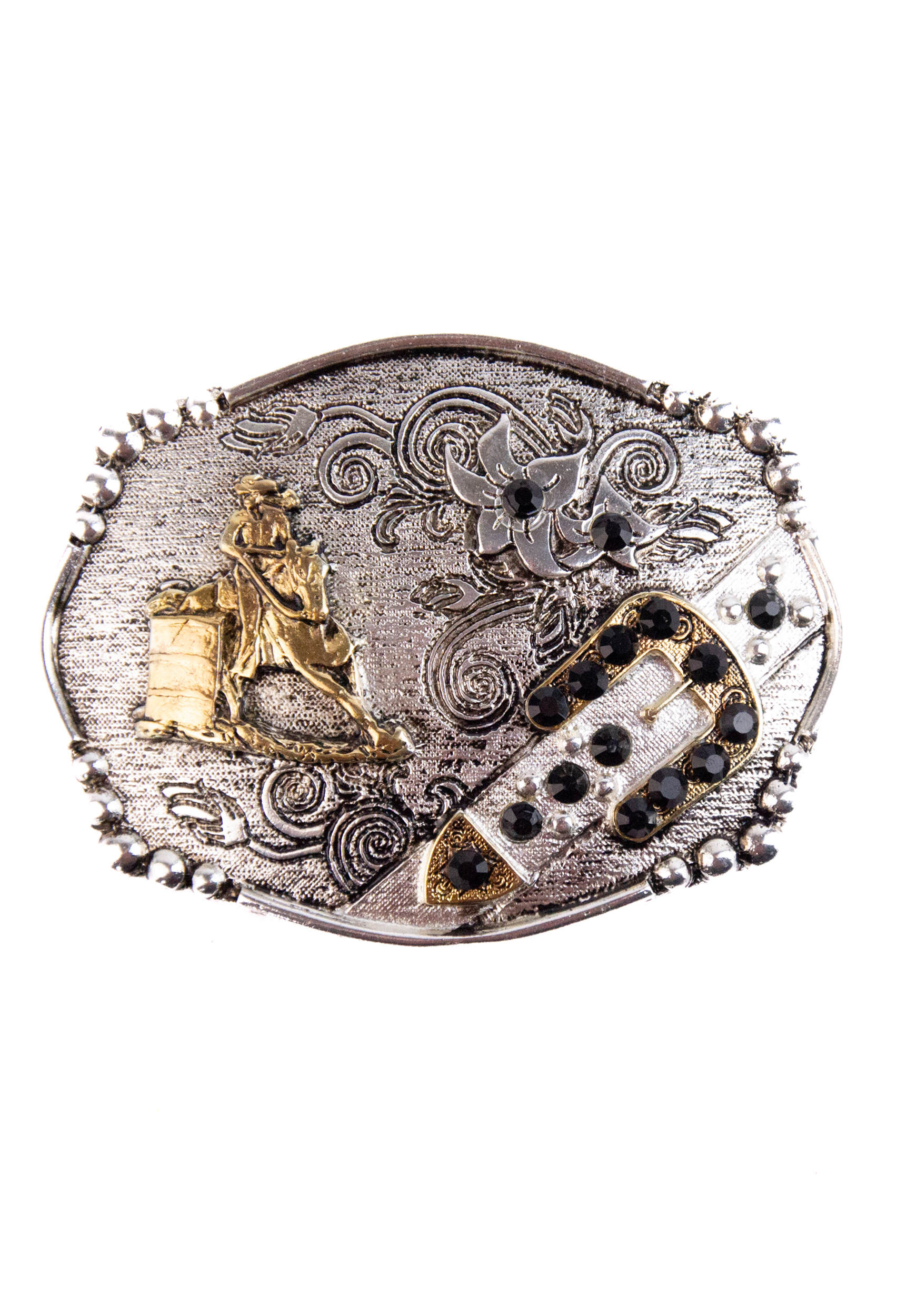 Fivela western com design autêntico, destacando o cowboy em ação no rodeio. Possui acabamento em prata envelhecida, detalhes em dourado e pedrarias pretas que trazem ainda mais estilo e personalidade ao acessório.