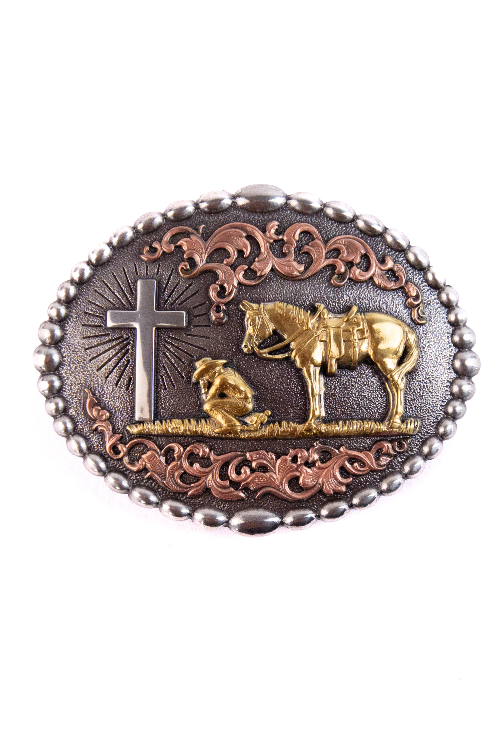 Fivela da Nocona com design sofisticado e rico em detalhes. Modelo oval com motivo de cowboy e cavalo em oração em dourado envelhecido, acompanhado de uma cruz em prata envelhecida. Possui arabescos em cobre ao redor do desenho, trazendo profundidade e destaque à peça.