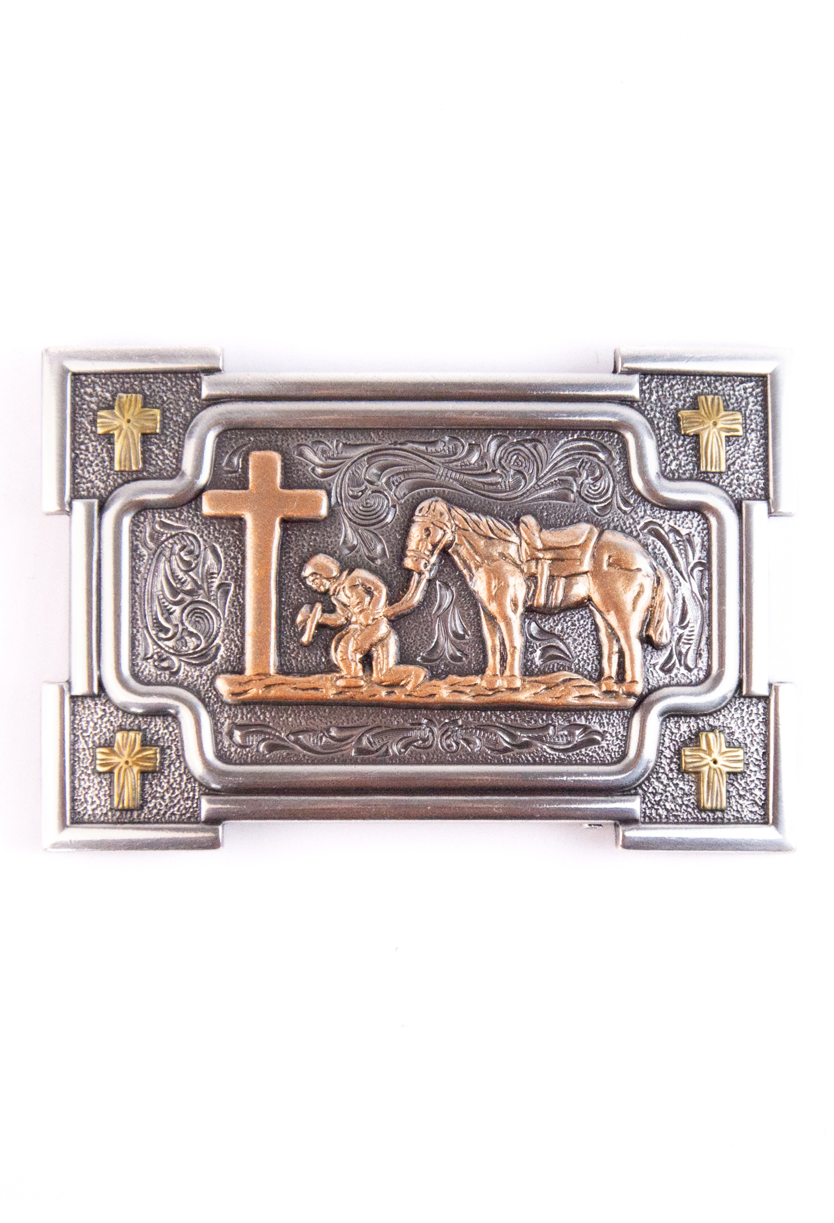 Fivela country original importada Nocona, com design imponente que representa fé e tradição do universo western. O relevo detalhado traz a cena clássica do cowboy ajoelhado ao lado do cavalo diante da cruz, transmitindo força, respeito e identidade country.