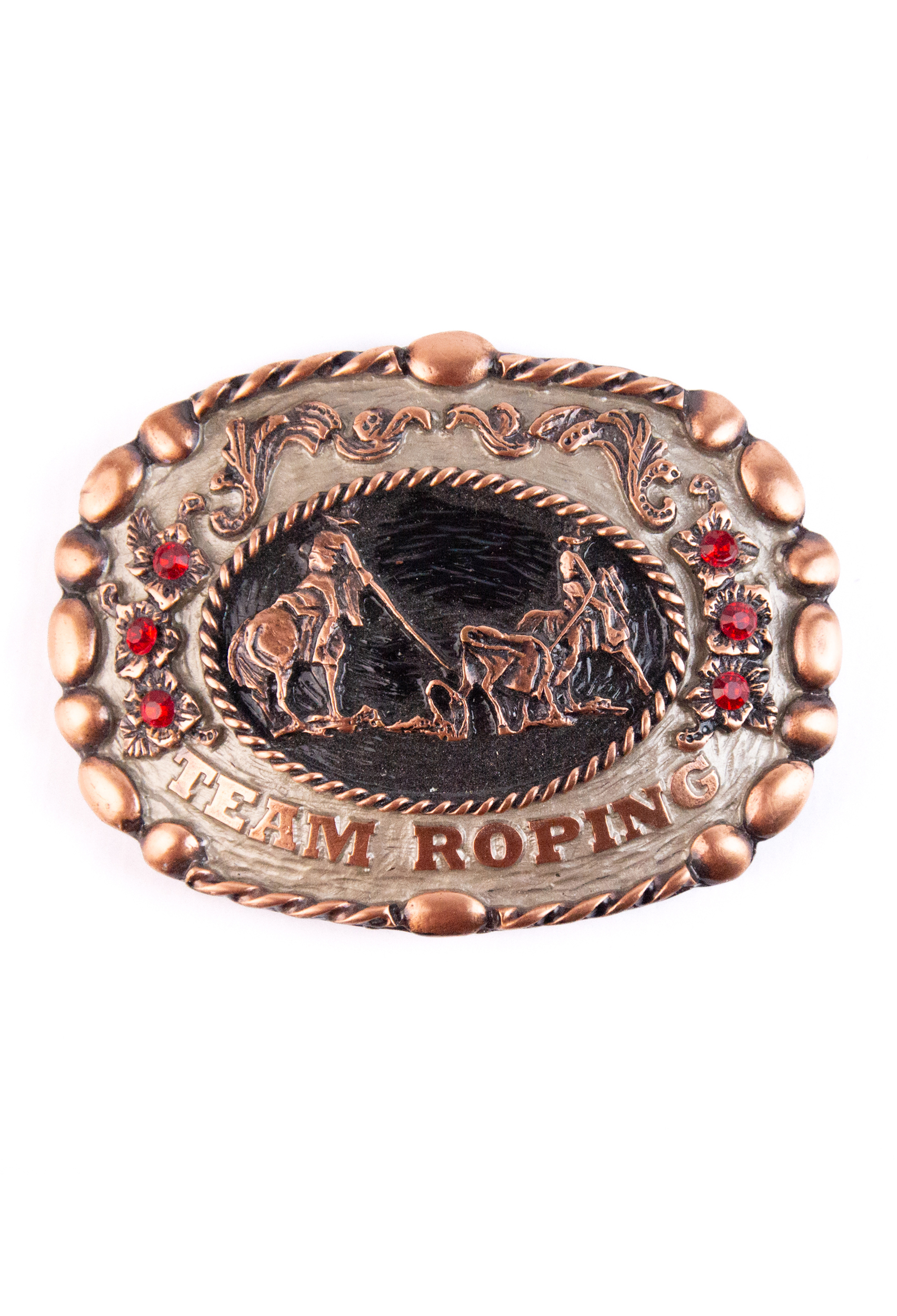 Fivela country estilo rodeio com relevo de Team Roping, representando a cena de laço a cavalo. Possui acabamento em cobre envelhecido e pedras vermelhas decorativas que destacam o visual western.