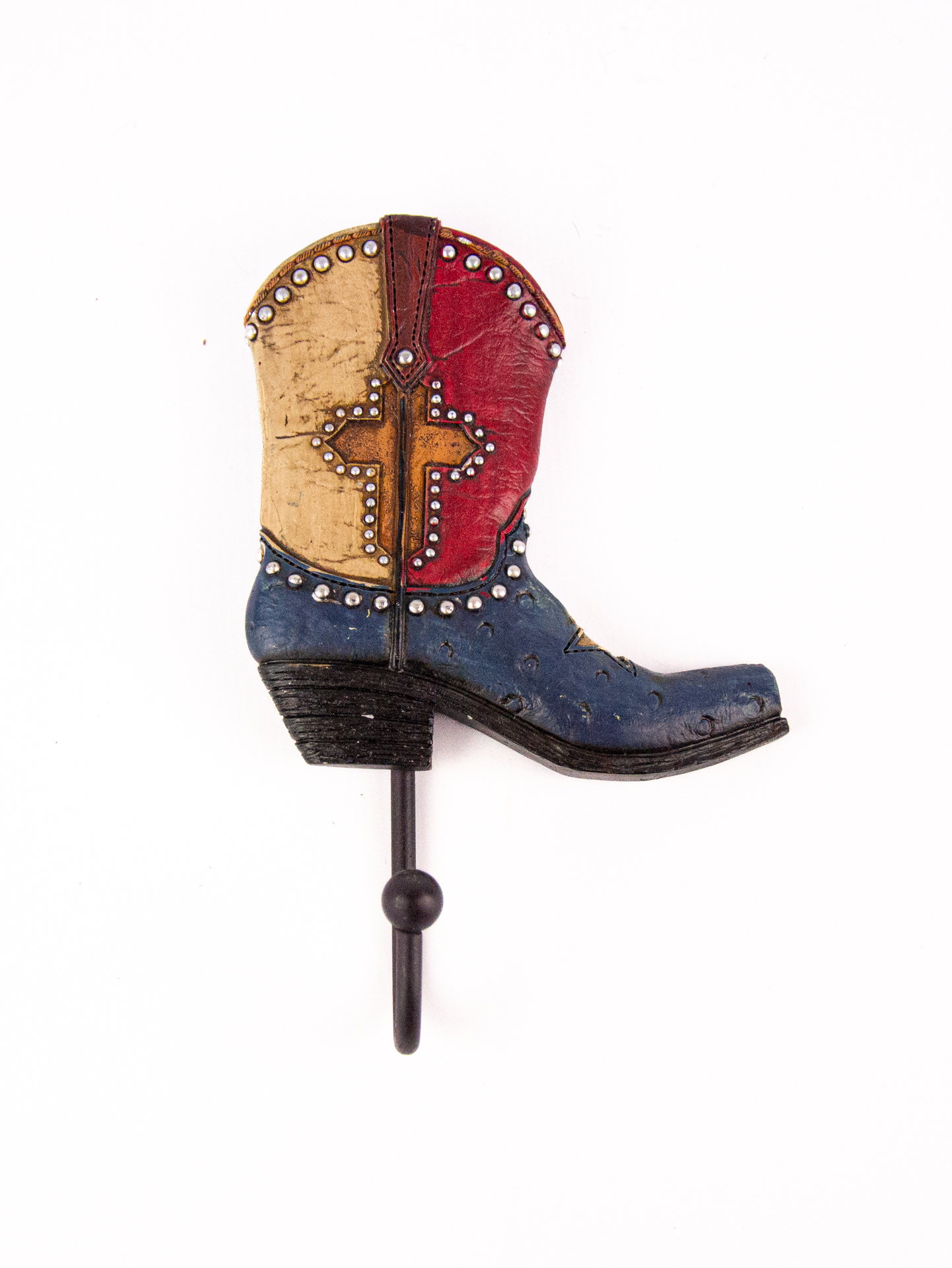 O gancho de parede decorativo em formato de bota western é uma peça exclusiva de estilo country, ideal para compor ambientes rústicos, temáticos ou de inspiração western. Com design detalhado e acabamento artesanal, a peça apresenta aplicação de metálicas e pintura em cores contrastantes, trazendo autenticidade e personalidade à decoração.