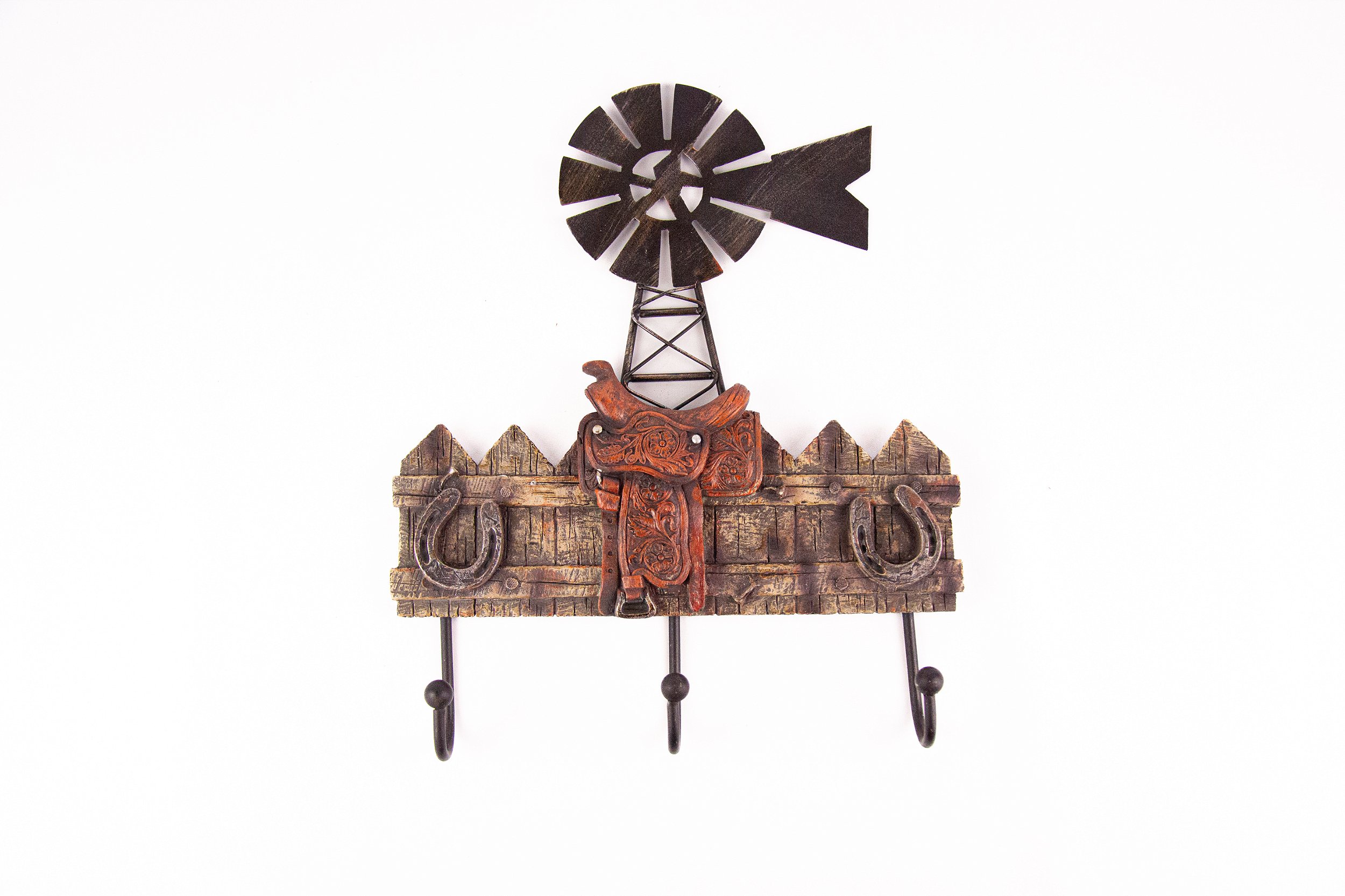 Seu design exclusivo apresenta detalhes em formato de sela sobre uma cerca, além de ferraduras e um moinho metálico, elementos clássicos que remetem ao autêntico estilo country americano. Além de decorativo, é perfeito para pendurar chapéus, bolsas, cintos, casacos ou acessórios, ajudando a organizar o ambiente com personalidade.