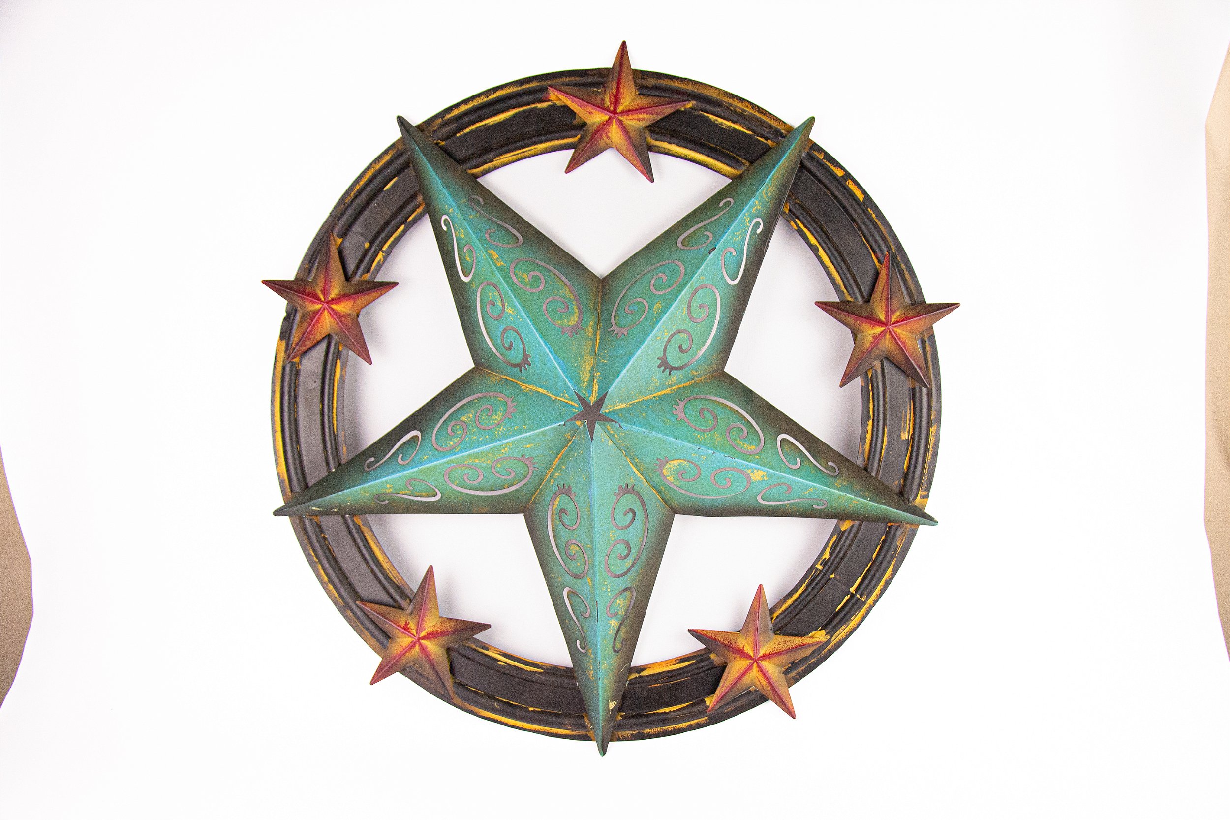 Placa decorativa redonda com design inspirado no Texas, no meio da peça uma estrela em alto relevo na cor turquesa . Uma peça clássica do estilo Western, ideal para compor ambientes rústicos, country ou temáticos, adicionando identidade e personalidade à decoração. Perfeita para paredes de salas, áreas gourmet, varandas ou espaços com inspiração americana.
