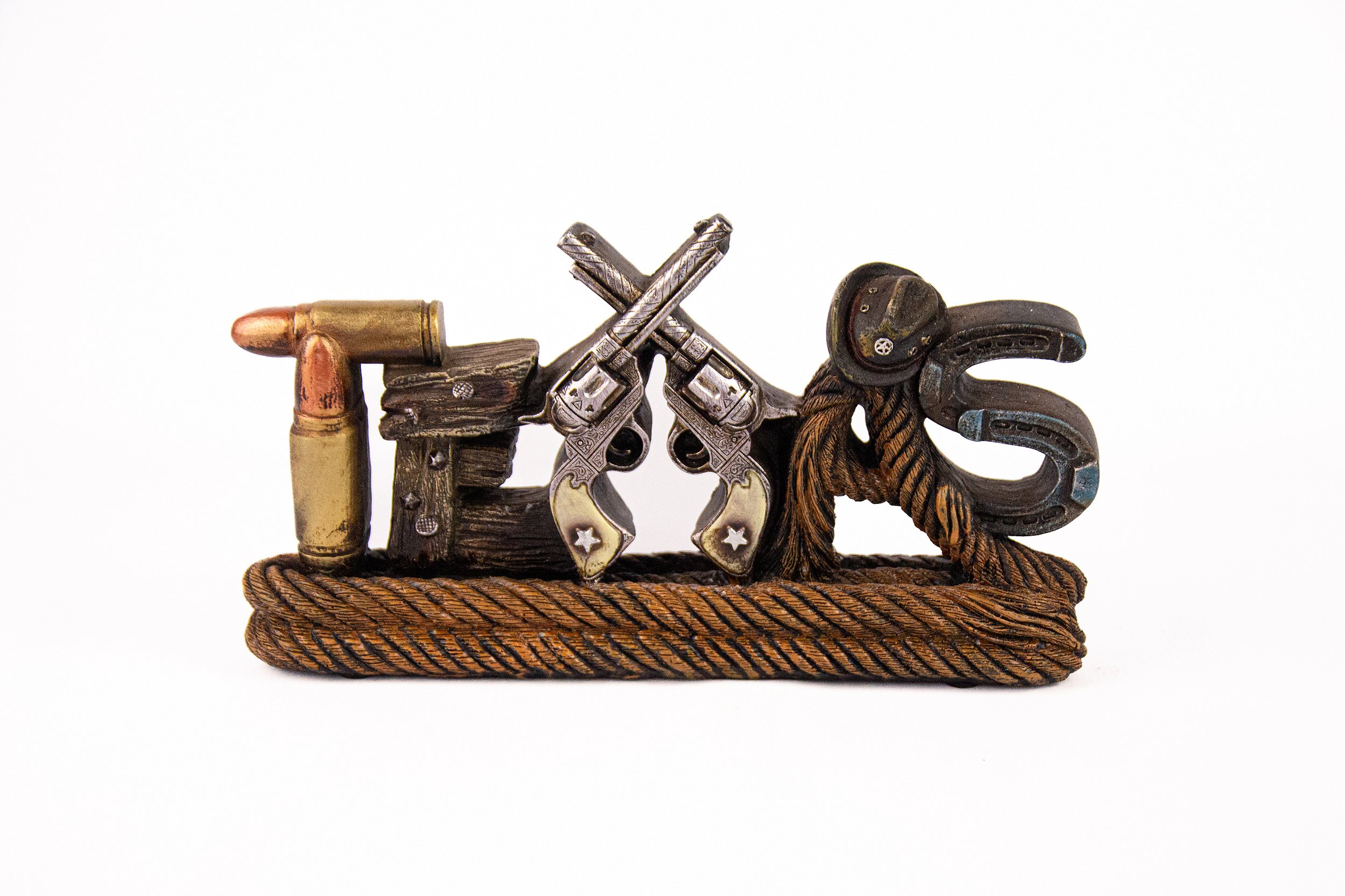 Autenticidade e espírito western em uma única peça. Esta placa decorativa country importada é confeccionada em resina de alta qualidade e apresenta um design criativo e cheio de personalidade, onde diversos elementos clássicos do Velho Oeste se unem para formar a palavra “Texas”.