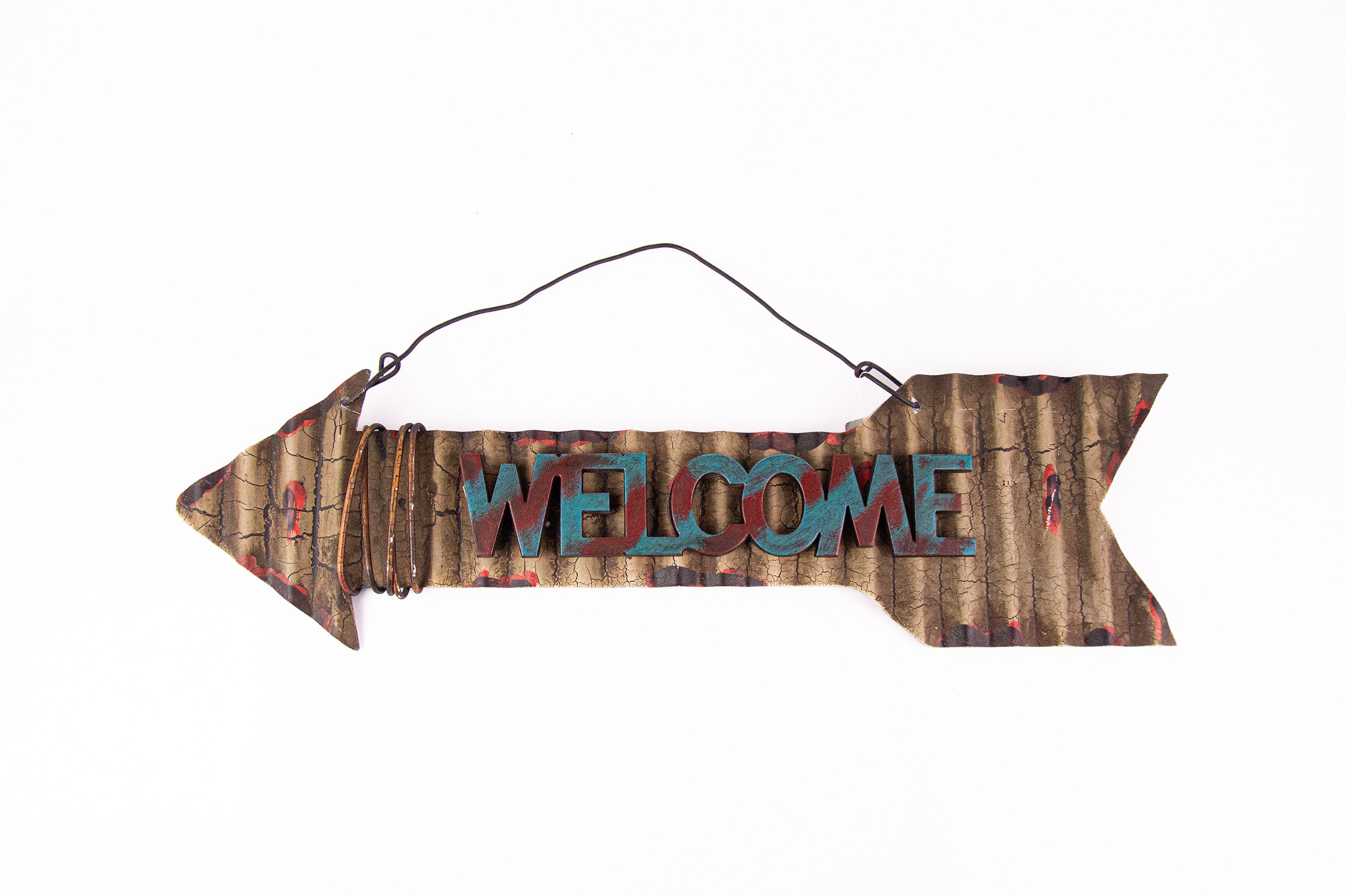Placa decorativa em metal com escrita “Welcome”, design rústico e estilo country. Ideal para dar boas-vindas e compor a decoração de entradas, varandas e ambientes internos.