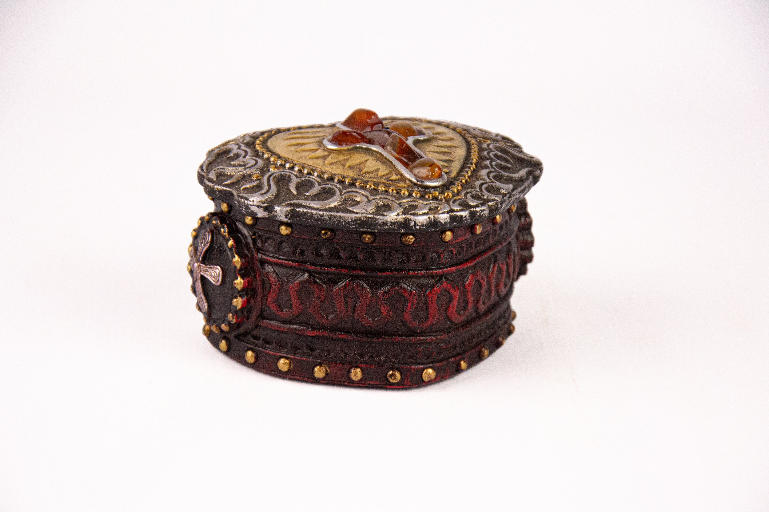 Porta-jóias decorativo em formato de coração, com acabamento rústico e detalhes ornamentais em alto-relevo. A tampa possui aplicação de cruz central, trazendo um toque delicado, simbólico e sofisticado à peça. Ideal para armazenar joias, bijuterias ou pequenos objetos, unindo funcionalidade e decoração em um único item.