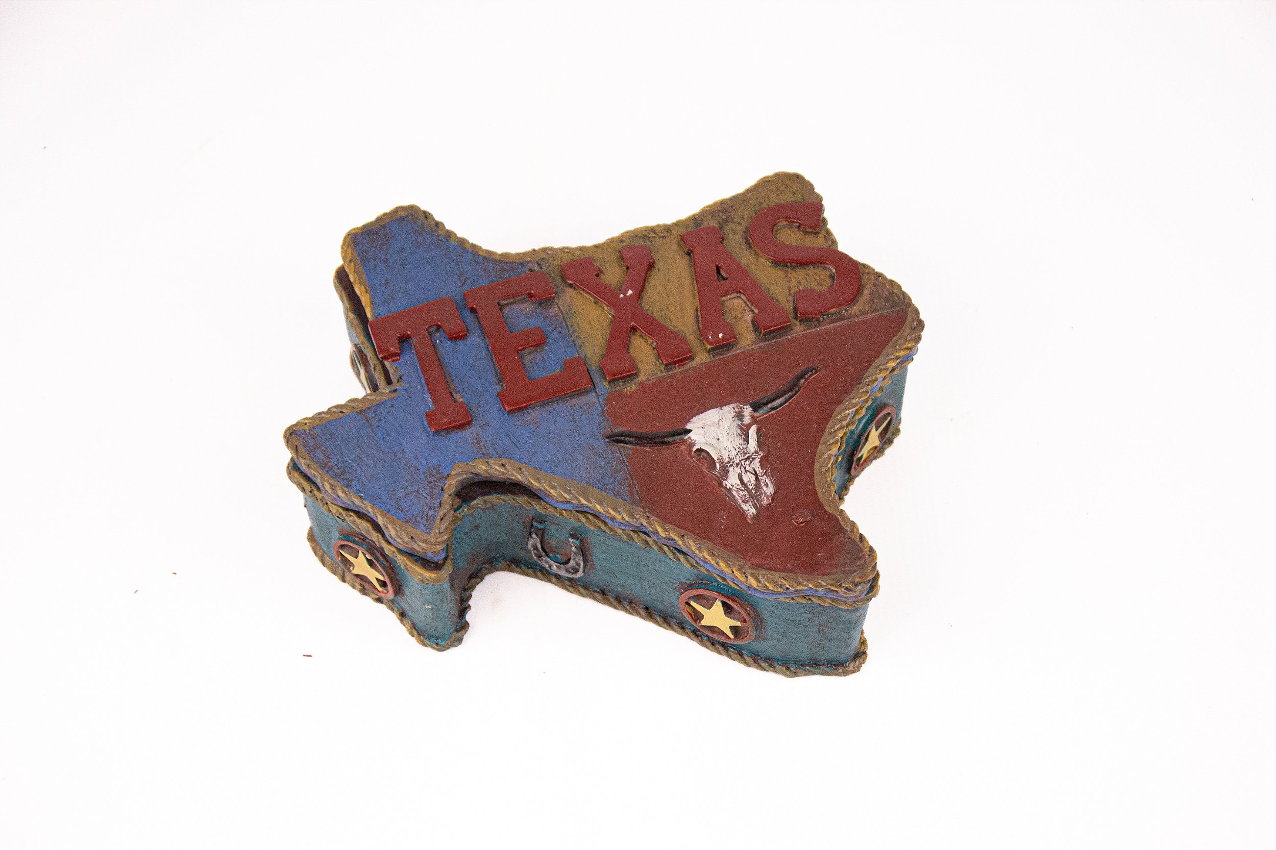 Porta-joias decorativo em estilo country, com design em formato do mapa do Texas. Possui a inscrição “Texas” e detalhes temáticos em long horn, estrela e ferradura, elementos clássicos da estética western. Ideal para organização de pequenos objetos e joias, agregando funcionalidade e identidade rústica à decoração. Uma peça decorativa que valoriza ambientes country e temáticos com autenticidade.
