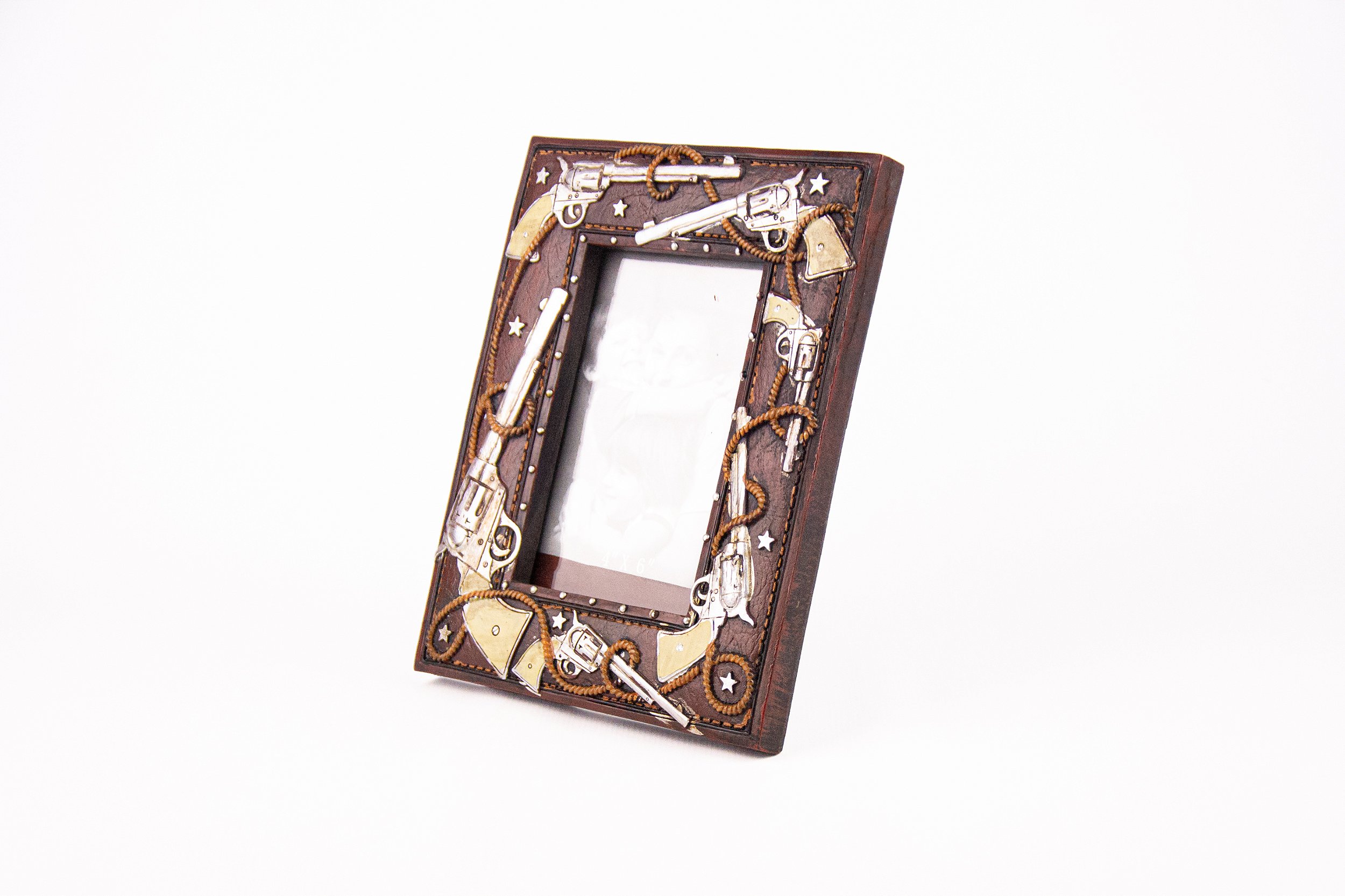 Porta-retrato decorativo produzido em resina, com acabamento que remete à madeira. Possui detalhes em formato de pistola, inspirados na estética country e western, trazendo personalidade e estilo rústico à peça. Ideal para compor ambientes temáticos, une funcionalidade e design marcante, valorizando fotos com autenticidade.
