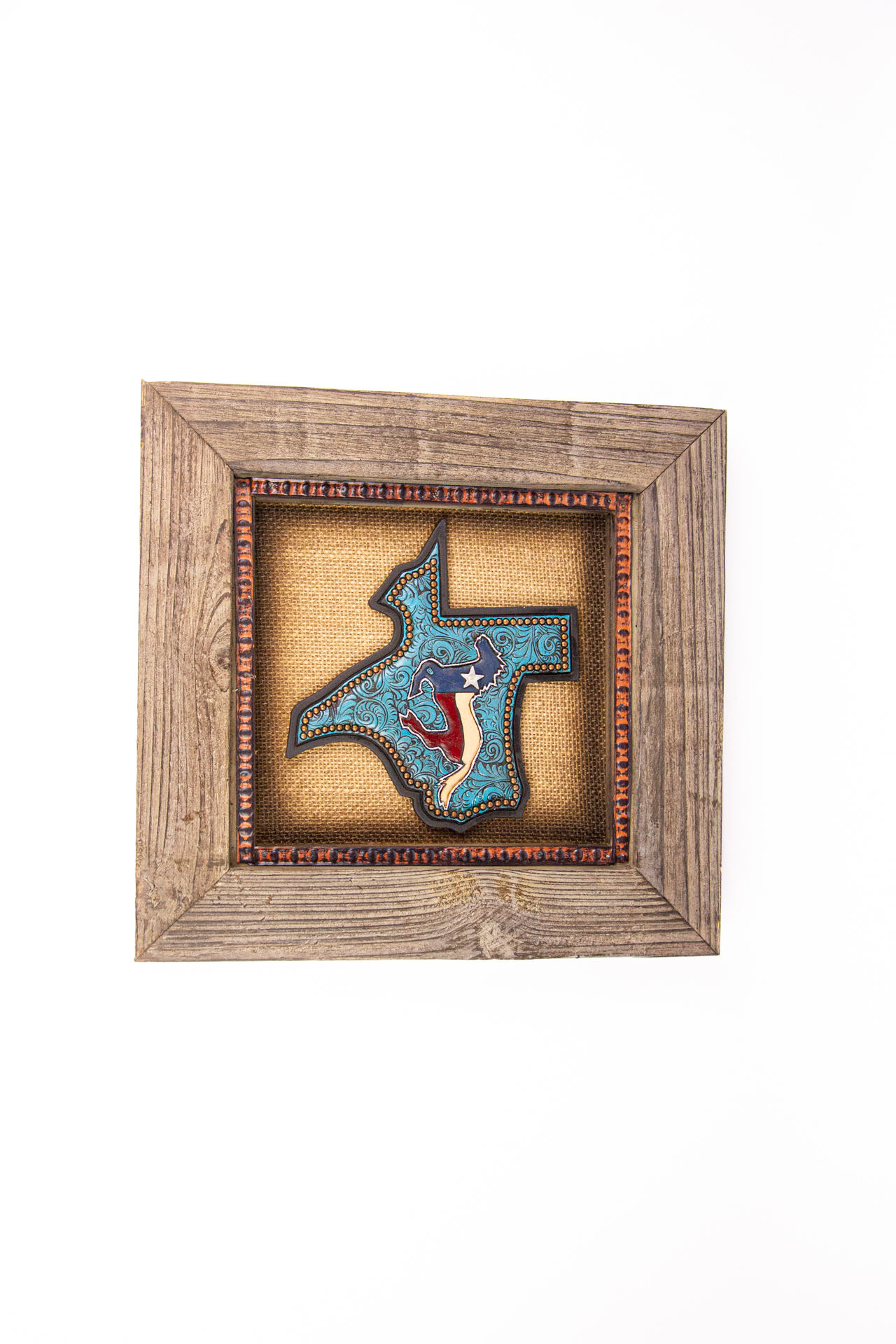 Este quadro decorativo traz o formato icônico do estado do Texas, ricamente trabalhado com detalhes floral turquesa e a um cavalo ao centro .A peça combina rusticidade e charme, com moldura em madeira de acabamento envelhecido e fundo em textura natural que valoriza ainda mais o design artesanal.