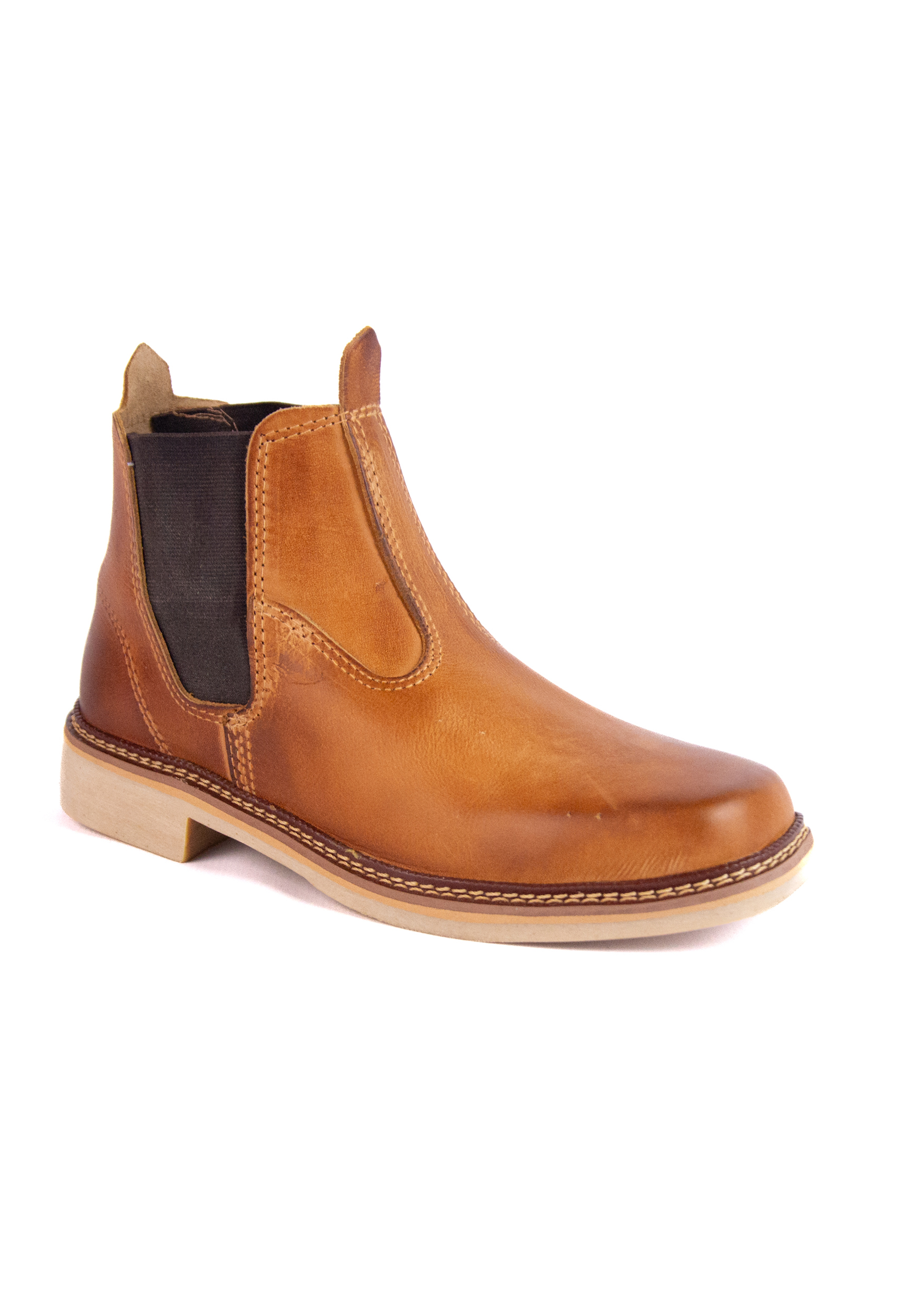 Botina em couro legítimo na cor caraelo, com acabamento levemente envelhecido que traz charme e autenticidade ao modelo. Possui elástico lateral para calce fácil e solado resistente, garantindo conforto e durabilidade para o dia a dia.